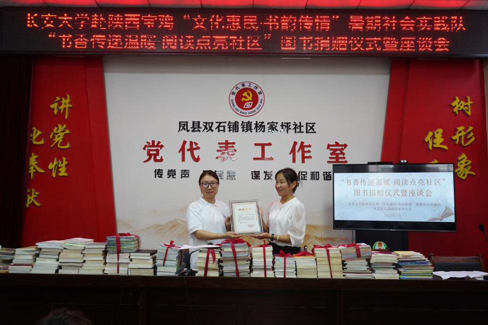 7月16日下午,长安大学赴陕西宝鸡“文化惠民·书韵传情”暑期社会实践队向凤县双石铺镇杨家坪社区捐赠图书400余册,“书香传递温暖·阅读点亮社区”图书捐赠仪式暨座谈会在杨家坪社区党代表工作室内成功举办。此次活动为基层公共文化服务体系注入青春活力。