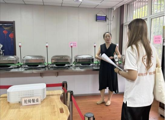 实践队与社区党委书记练鹏飞、副主任魏莉座谈,深入了解了社区养老服务的基本信息、管理运营模式、服务内容、发展瓶颈及居民参与反馈等情况。在服务内容上,养老服务站提供餐饮、康养保健、文娱活动、老年大学、便民超市、“和事佬”议事厅、法律援助等多元化服务。其中,老年餐厅单日使用频次达300-400人,各类文娱活动和老年大学参与度极高,充分满足老年人的生活与精神需求。针对高龄、失能等特殊老年群体,社区实行“红、黄、蓝”三色管理机制,由楼栋长专门照料,还设有助餐助浴、临终关怀室和白事理事会,满足不同老年群体的多样化养老需求。但社区养老服务站也面临专业人才短缺、家政服务供不应求、适老化改造滞后等挑战,“上楼难”成为高龄、残疾、行动不便老人日常出行的首要阻碍。