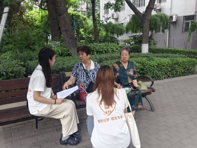 实践队成员走访调查社区老人,通过问卷进一步了解老人对社区嵌入式养老服务的知晓度、体验度和满意度。