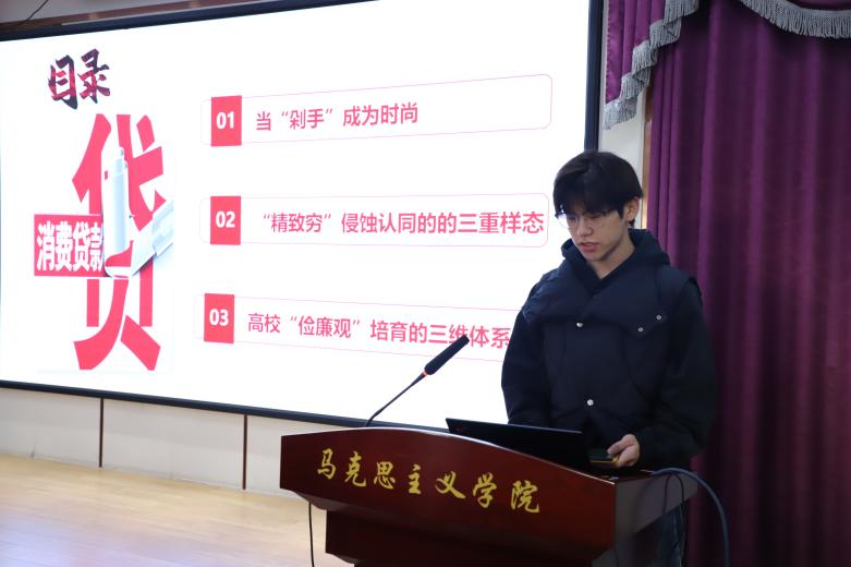 在成果分享交流环节,我院本科生梁俊辉同学作为获奖代表之一,围绕其作品《从“精致穷”到“俭廉观”:消费主义影响下青年廉洁教育的破局路径》进行了精彩汇报。他深入剖析了消费主义现象对青年价值观的冲击,并提出了高校廉洁教育的创新路径,展现了长大学子敏锐的时代观察力和扎实的理论分析能力,其观点获得了现场师生的广泛关注与好评。