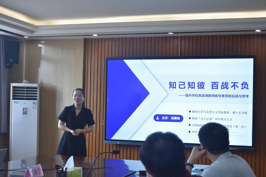 开幕致辞结束后,首先由湖南大学汤素娥教授分享思政课教学经验,以“从时间压力到困境突围:青年思政课教师专业成长的探索与反思”为主题,核心围绕“知己知彼,百战不殆”展开讲述。“知己”方面,她结合自身经历,强调思政课教师需明确职业初心,认清专业理论功底、板书能力等职业素养,通过自评、他评客观认识自己,在教学中扬长避短,从盲目自信或恐慌走向笃定。“知彼”上,她指出要了解思政课体系,各课程(如马原、毛概等)各有特质,是协同共同体,还需调研学情,消解学生焦虑,以学生为中心设计教学。此外,她分享打造优质课堂的方法,强调通过公开课堂、教学比赛锤炼能力,直面“水课”问题,呼吁教师坚守初心。最后提出教师成长三重境界,鼓励大家在立德树人征程中找到职业幸福,凝聚力量共促思政课发展。