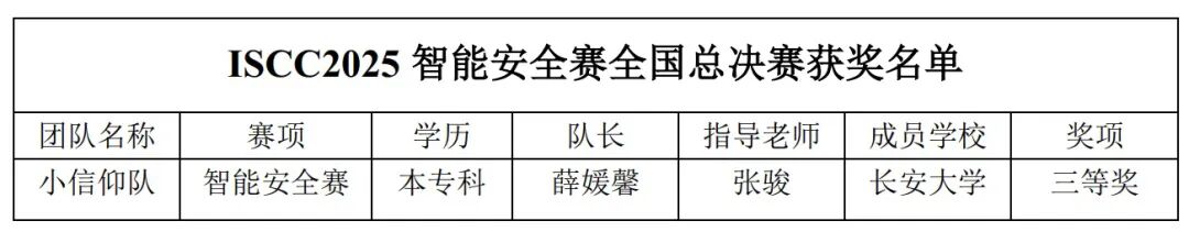 近日,2025年第22届全国大学生信息安全与对抗技术竞赛(ISCC)全国总决赛在西南林业大学落幕。本届大赛由中国兵工学会、北京理工大学、教育部信息对抗技术专业虚拟教研室主办,中国兵工学会信息安全与对抗专业委员会、北京理工大学信息系统及安全对抗实验中心(工信部)承办、西南林业大学协办。大赛吸引了全国313所高校的1596支参赛队伍、共计3000余名师生同台竞技。我院学子薛媛馨在张骏老师的精心指导下,经过校赛、区域赛和全国总决赛的层层选拔,最终斩获全国三等奖。